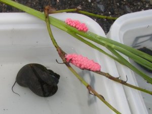 サカマキガイ・マシジミ・マルタニシ・ジャンボタニシと卵(稲やコンクリトに産卵している)