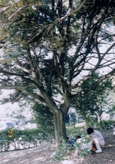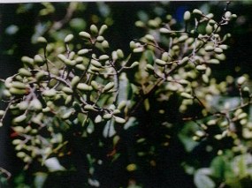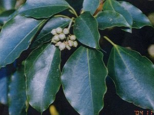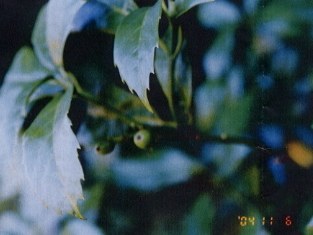 【右】カクレミノで、もう直ぐ実が紫色になります。膚の弱い人は樹液でかぶれますから注意。