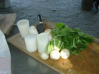 【左】山本シェフが準備したスズナ、スズシロ   【右】“七草がゆ”食べてます。