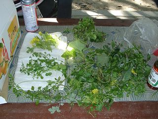 【右】摘んできた葉っぱ。セリ、ナズナ、ハコベ、ホトケノザ(コオニタビラコ)、タンポポ、ハルノノゲシ、フキなど