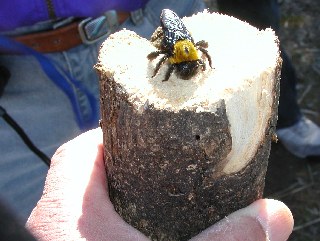 【左】穴に中に何かいるみたいです。 【右】クマバチだ出てきました。やささしいハチですがつかむと刺されます。