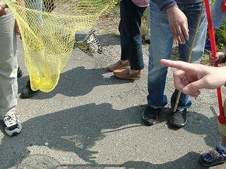【左】稲荷神社で毛虫(オビカレハ)にさわりました。    【右】子どもは蝶が来るのを待ち構えています。