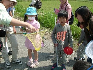 天気がよく気温がぐんぐん上がり暑いくらいでした。地域文化センターから田んぼ道に出ました。生き物活動が活発で、子供たちはチョウを追いかけましたが中ンかつかまりません。大人が手伝って捕まえることができました。ワスレナグサの仲間のキウリグサが可憐の花をつけていました。これを揉んで嗅いだところキウリの匂い、みんなで名前のいわれを納得しました。道の土手で、テントウムシの成虫、幼虫、さなぎ、を同じ場所で見ることができました。小さな子供たちが多かったので、ヨシの葉で草舟をつくったり、カラスノエンドウのさやで草笛を作ったりして楽しく遊びました。