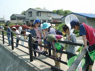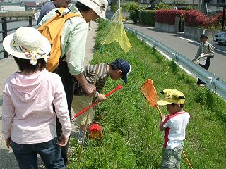 【左】ウシガエルが呼んだのでみんなで振り返りました。