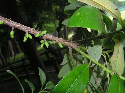 【右】ミミズバイの若い果実。熱帯系の樹木は枝に実をつけることが多いです。