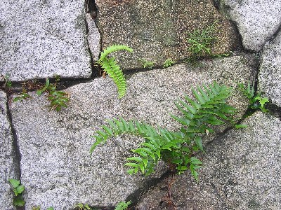 【左】大草城の城垣にオニヤブソテツ、ベニシダ、イノモトソウなどのシダが生えていました。