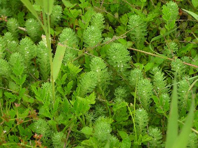 【右】有害雑草の外来植物の一つであるオオフサモが休耕田に生えていました。