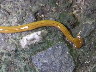 【左】気がついたものをメモをする様に道具を持っています。    【右】神社の石の下から出てきました。扁形動物のコウガイビルです。動物食でナメクジなどを食べます。