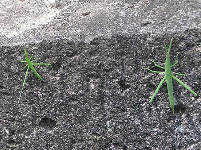 【右】ショウリョウバッタの幼虫がブロック塀にいました。