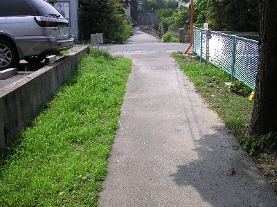 【左】舗装の両端に緑があります。草を嫌う人もいますが、熱をたくさん吸収してくれます。