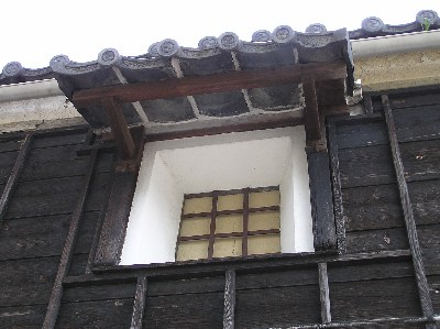 【右】倉庫の窓に蝶番(ちょうつがい)が付いていて、火災の時に瓦で蓋が出来るようになっています。