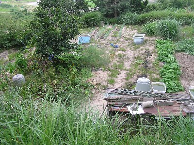 【右】この畑は、廃品を利用して貯水槽を作ってあります。