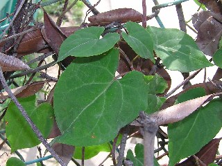 【中】ツルドクダミがテニスの防球ネットに絡み付いていました。緩下剤や血圧降下などの薬用に使われます。