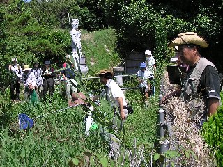 【左】大祥院前の小さな水溜で大きなタモを振っています。