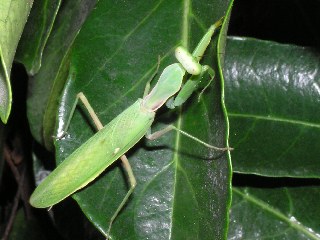 【中】ハラビロカマキリの色は少し木の葉より薄かったです。