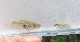 【中】カダヤシ(北アメリカ)。左が雌、右がオスです。メスは大きなお腹に卵胎生で赤ちゃんを育てています。
