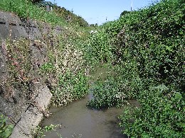 【右】川の中に草が生えています。草が生えると草が生き物の産卵場所や隠れ場所になってたくさんの種類の生き物が住めます。