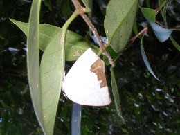 【右】ウラギンシジミが風を避けてテイカカズラの葉の裏にいました。