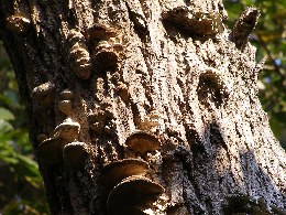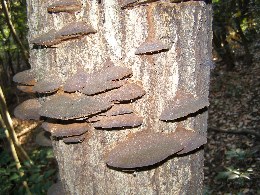 【中】コナラに古くなったキノコがたくさん生えていました。クジラタケみたいです。