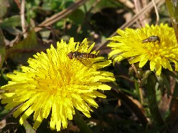 【左】セイヨウタンポポにヒラタアブとハエの仲間が来ていました。