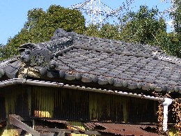 【右】学校のマークが入って瓦が作業小屋に乗っていました。