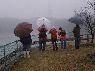 佐布里池では、雨で、もやがかかり非常にみにくく最悪の状態ですがその中、ミコアイサのオスがいました、体の白と目のまわりの黒色から、パンダガモの愛称で呼ばれています、とてもきれいな鳥ですね。オシドリがいるはずなんですが、残念ながら見られませんでした。マガモ、カルガモが多いです、今日は全部で17種類確認できました。梅の館で餅つきがあり餅をもらい食べながら解散しました。(記・岩崎)