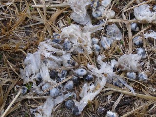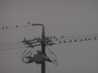 【左】ペリットみたいです。内容物はザリガニとナンキンハゼの種子みたいです。【右】ムクドリが電線から変わり者を見下ろしていました。