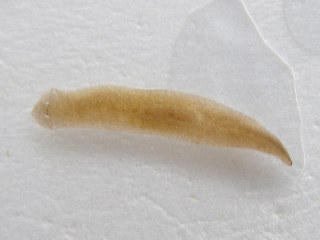 【左】ウズムシ。全国水生生物調査の指標生物のうち水質階級T・きれいな水に住む生き物です。