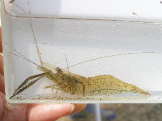 【右】テナガエビ。テナガエビは指標生物に入っていませんが水質階級U・少し汚い水の生き物として良いと思います。