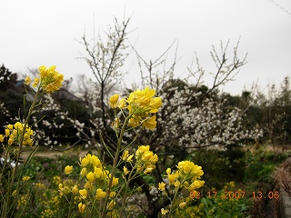 【左】ウメと菜の花が満開です。 【右】スズメの集団が来ました。