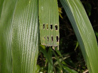 【左】ヤダケの葉に変な模様がありました。(新芽で葉が丸まった時に虫に食べられた)