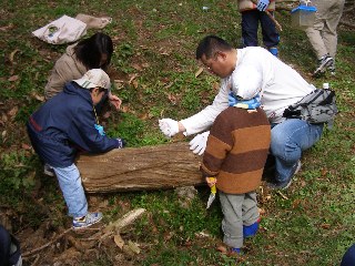 【右】大きな朽木に挑戦しています。