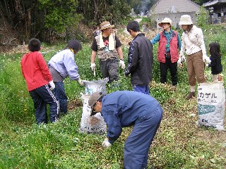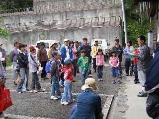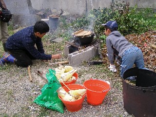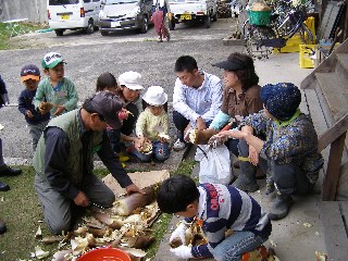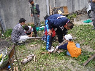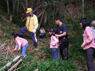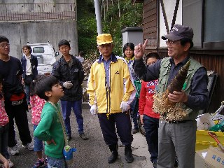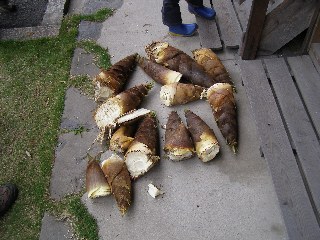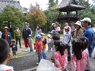 事前申込み定員の30名を遥かに超える盛況振りに嬉しい悲鳴をあげました。本堂前の境内前に全員集合、自然調査隊の活動趣旨再確認と本日の行動スケジュール説明後、先ず本堂裏のモウソウダケ竹林に皆が整然と穏やかに入り筍狩りをスタートしました。筍の先端を目を凝らし、足で感触を確かめること数分経つ頃「あった〜」、「見つけた〜」の子供達の喜びの歓声、親子で慎重に掘ること約40本の収獲でした。大鍋で沸かした熱湯に糠共々湯掻きを開始しました。次に来月のサツマイモの苗植え予定地の野草を観察しながら草取り・畝整備を行いきれいにしました。