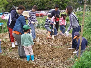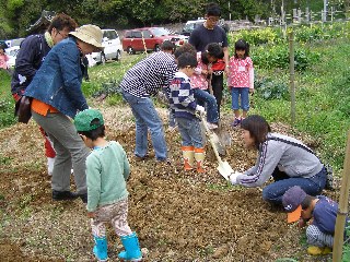 【左】タケノコ掘りに細腕で挑戦です。 【右】牛糞を入れスコップで耕しています。