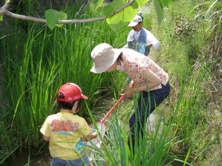 【左】はしごを使って川に降りました。 【右】どんな生き物が見られたでしょう。
