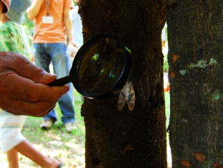 羽化が終わり羽根が乾くのを待っている「セミ」を観察。小川では「オオシオカラトンボ」「シオカラトンボ」の違いの説明を聞きました。