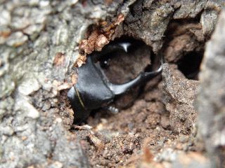 【左】コクワガタが「皆さんこんにちは!」 【右】ケヤキから新芽が出ました。