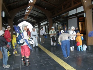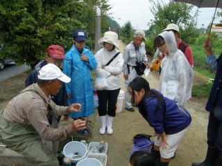 【左】雨の中、好き者が集まってきました。担当者が実施を決定。 【右】川へ行く道中は小雨でした。