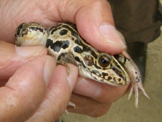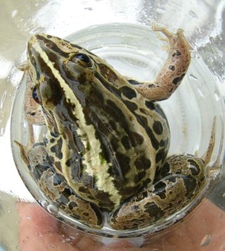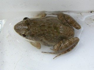 【右】トノサマガエルとダルマガエルの違い。トノサマガエルの足をたたんだときにに足が耳を越えます。(長い)