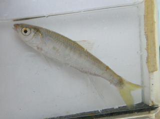 【左】上から見たオイカワ。カワムツに比べほっそりしている。