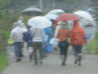 小雨の中、観察会をぎめる。決定したら子供たちは喜び、顔が輝いていので担当者も大変うれしく思いました。本来、雨降りでの川の観察は中止するところです。最新のレーダーを見ると西側には雨雲が見られなく、悪天に向かうのではなく、好天に向かっているみたい。思い切って決定しました。傘を差しながら現地に移動しました。