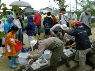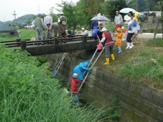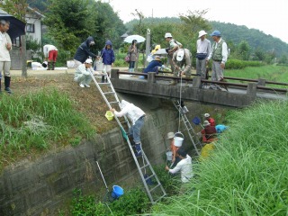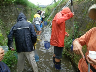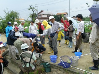 観察会を行った信濃川は、上流に生活廃水を流す所や工場廃水が出されるところはありません。よって、きれいな水質を保っています。川にゴミなどはほとんど捨てられていませんので安心して観察が出来ます。ただ残念なのは、土砂を浚渫したため川床が低くなりな産卵場所である水田に登れなくなったため最近見かけなくなりました。水田と川とを結ぶ魚道が欲しいところです。また、河床に下りる階段がないためはしごを使っていることです。何か危険があるとまずいのでしょうか、なるべく川に人が近づかないようにしているのでしょうか。階段がないのは少し残念です。(記・降幡)