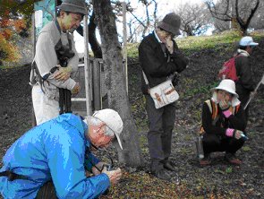 昨夜来の纏った雨も上がり、気温も10時ごろには16度になり、12月の観察会では暖かく昆虫たちも出現しそうな条件の良い外気温になった。その予感に違わず、ヤマトシジミ・キチョウ・ベニシジミ・ナミトントウムシ・ヨコズナサシガメの昆虫が観察されたし、キノコも5種類見られ、特にナメコもあり、身近にある事は以外であった。晩秋から初冬の風物光景であるモズに早煮えされたクルマバッタモドキモが低木で観察できた。(記・南川)