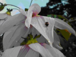【右】ナミテントウムシが園芸種のコウテイダリヤの花に