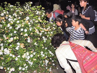 梅雨の合間で、ホタルが飛んでいるか、大変心配でしたが、田んぼや樹木の間で光るヘイケホタルを見付けると、子供達の「ホタルだ〜」と歓声があがり、ほっとしました。あぜ道では、子供の手にホタルがとまったり、見付けたホタルを捕まえたり、大喜びでした。参加した、お父さんもお母さんも「こんな身近でホタルを見ることが出来てうれしいです。」と口々におっしゃってました。また、街灯があるところでは、ホタルがいなくなることを経験できてよかったです。灯火採集では、沢山の生き物が集まりました。(吉房記)