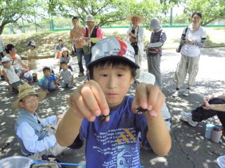 梅雨明けの土曜日 タモと虫かごを持参の親子 おじいちゃんとお孫さんそれぞれやる気満々です。2班に別れそれぞれ西と東に向かって観察開始 公園内は以外に静かで 蝉の鳴き声も全く聞こえず静かです。雨上がりのせいか キノコをいろいろ観察できました。カブトムシ クワガタ カナブンを見つけ 得意な子 つまめない子 トンボを上手に捕まえる女の子 それぞれ夢中になって虫を追いかけ楽しく観察することができました。 (記・高橋)