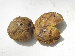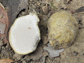 【左】ウスキニセショウロ        【中】ウスキニセショウロの内部        【右】キホコリタケ