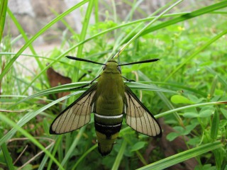 【右】オオスカシバ…「羽化した時は、翅に白い鱗粉がついているが、羽ばたきの激しさ故に鱗粉がほとんどとれてしまい,はねが透明になる」とのことなので、この写真は羽化後、まだ、激しく羽を動かしてないという個体ということでしょうか。