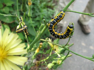 【左】ホソバセダカモクメ…アキノノゲシの葉を食い尽くしていました
