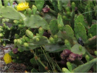 【左】路傍のウチワサボテン 【右】同左の花、つぼみ、果実…赤紫色→※指導員の一人が昔は食べたと言って、この実を食べていたが、誰も真似しなかった。帰宅後、ネットで調べたら、“食べられる”と記したページがたくさんありました 【左】田んぼのヒルを手づかみして細部を説明中